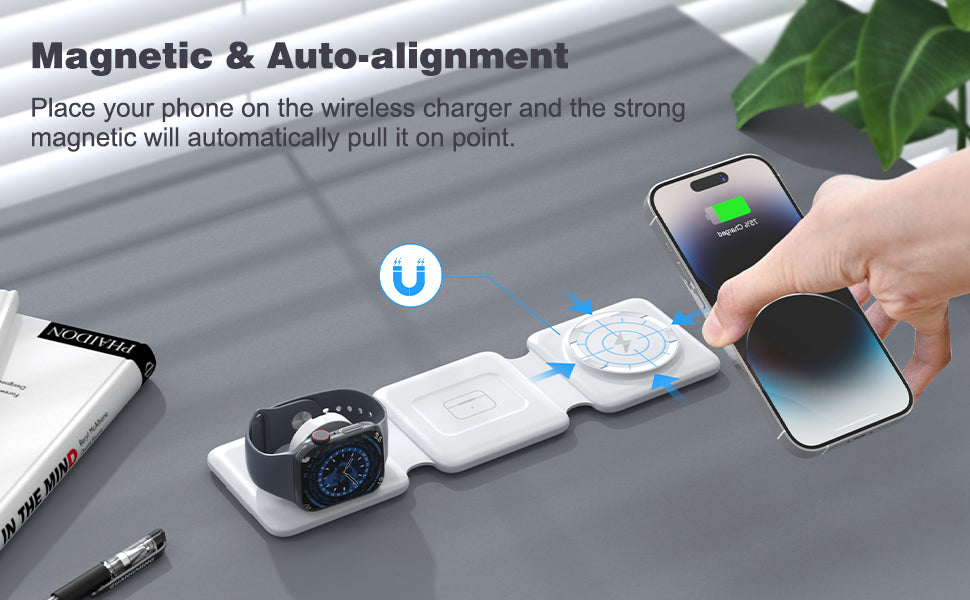3 in 1 charging station is compatible for iPhone 16/15/14/13/12 series, for iWatch series 10/9/8/7/6/5/4/3/2/Ultra/Ultra2/SE, for AirPods 4/3/2/Pro/Pro 2. The magnetic attraction function is only for iPhone 16-12 series.